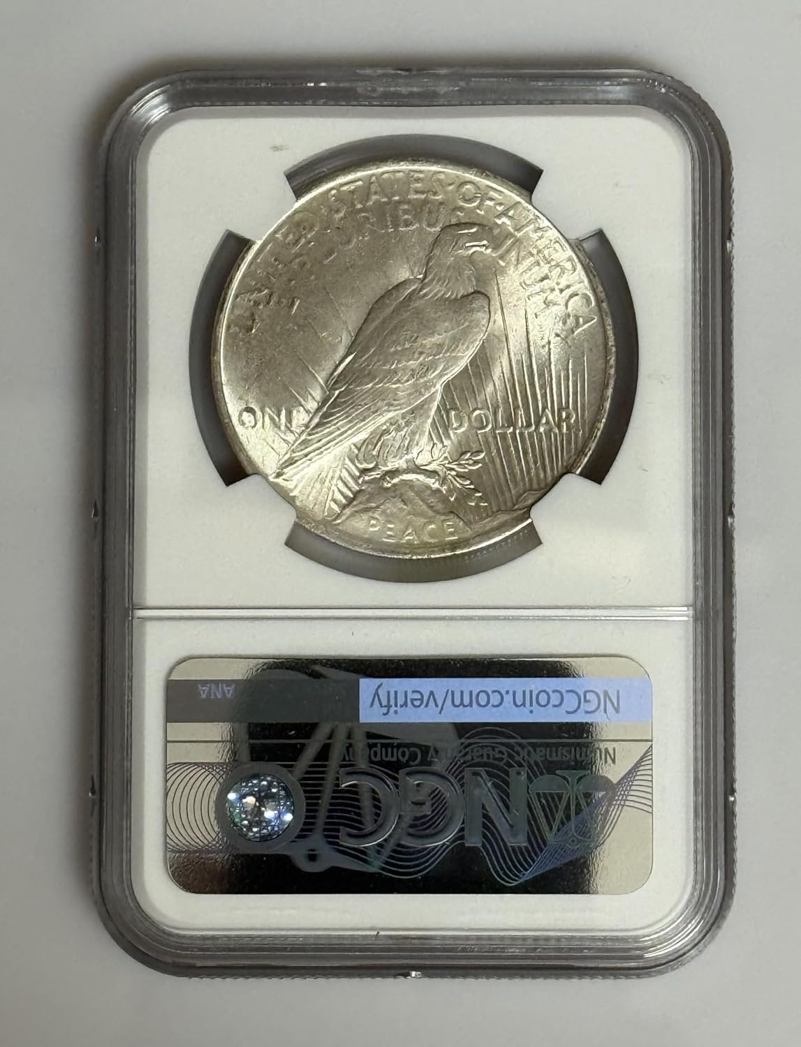The 1923 Peace Silver Dollar is a historic coin, minted to symbolize peace after World War I. Graded MS-64 by the Numismatic Guaranty Company, it showcases Lady Liberty’s detailed design and is in near-pristine condition. Weighing 26.73 grams and with a diameter of 38.1 mm, this coin contains 90% silver and is legal tender valued at $1. Encapsulated for protection, it appeals to both numismatists and collectors of vintage items.