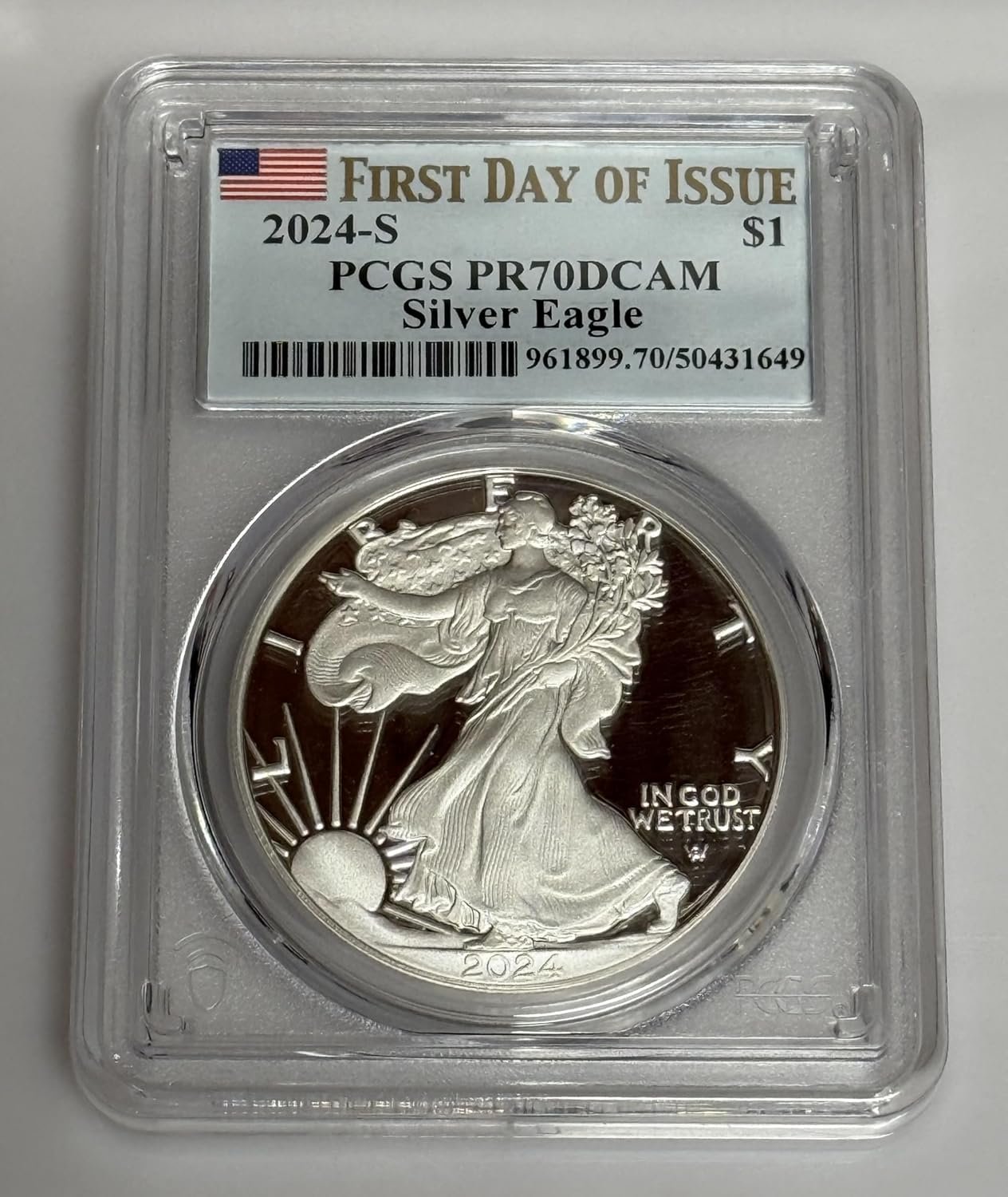 The 2024-S Proof Silver Eagle, graded PR70 DCAM by PCGS, epitomizes modern coin collecting. Marked as a First Day of Issue, it features the renowned Walking Liberty design with a deep cameo finish showcasing remarkable contrast. Struck at the San Francisco Mint, this flawless coin is encapsulated in a PCGS holder with a special Flag label, ensuring its pristine condition. Its .999 fine silver composition, combined with the perfect PR70 grade, makes it a highly coveted item for both experienced collectors and newcomers. This exceptional piece continues the U.S. Mint’s tradition of outstanding proof coinage.