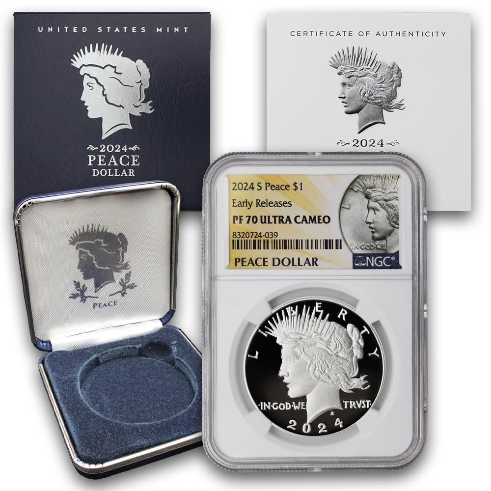 In December 1921, the Peace Dollar, designed by Anthony de Francisci and approved by Treasury Secretary Andrew Mellon, replaced the Morgan Dollar, symbolizing U.S. victory and peace after World War I. Reintroduced in 2021, it features Liberty on the obverse and an eagle with an olive branch on the reverse, both emphasizing peace. The coin weighs 2.4 ounces, measures 38.10 mm in diameter, and has a purity of .999 fine silver. It comes in a graded NGC holder from the U.S. Mint and has received high customer ratings.