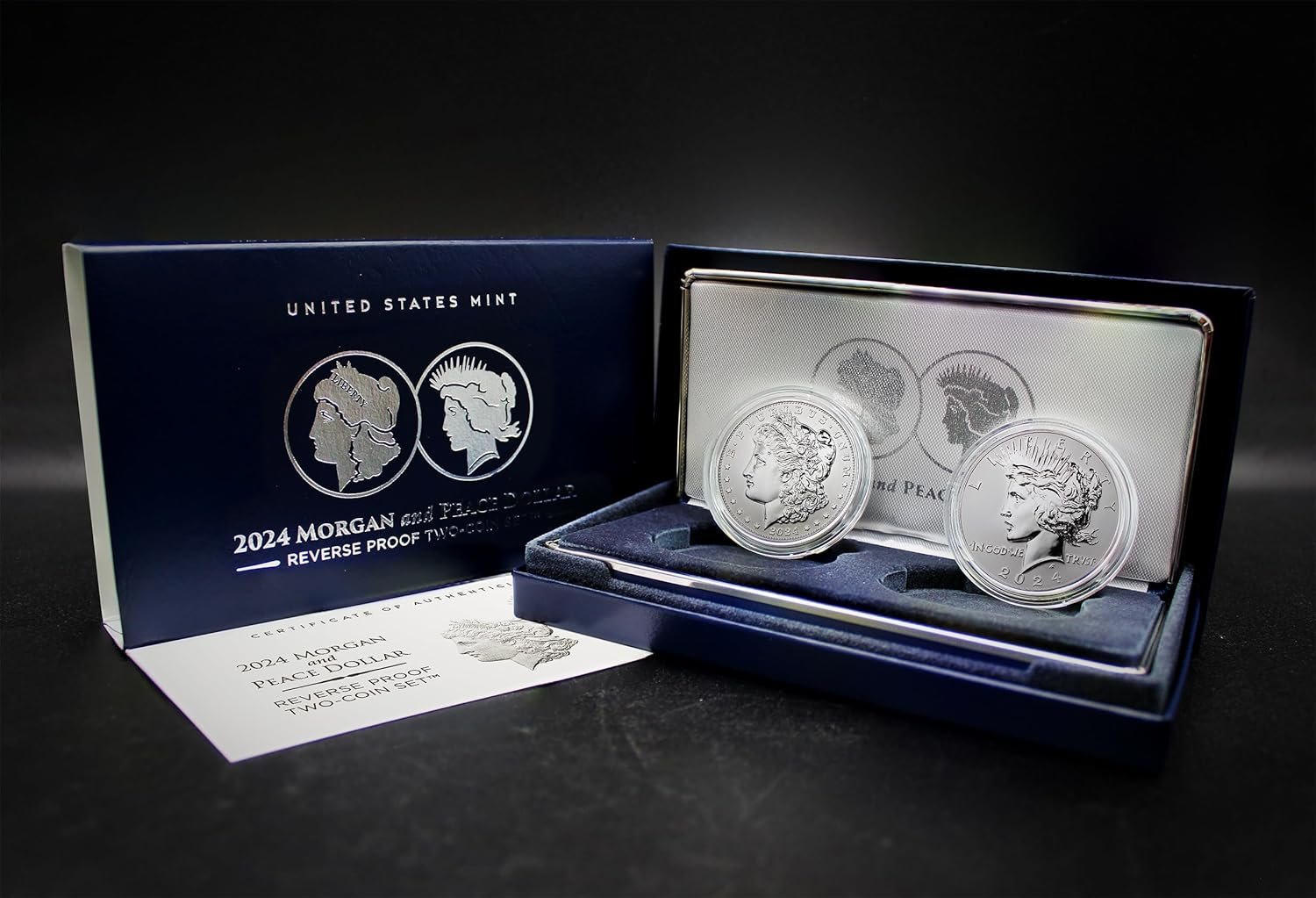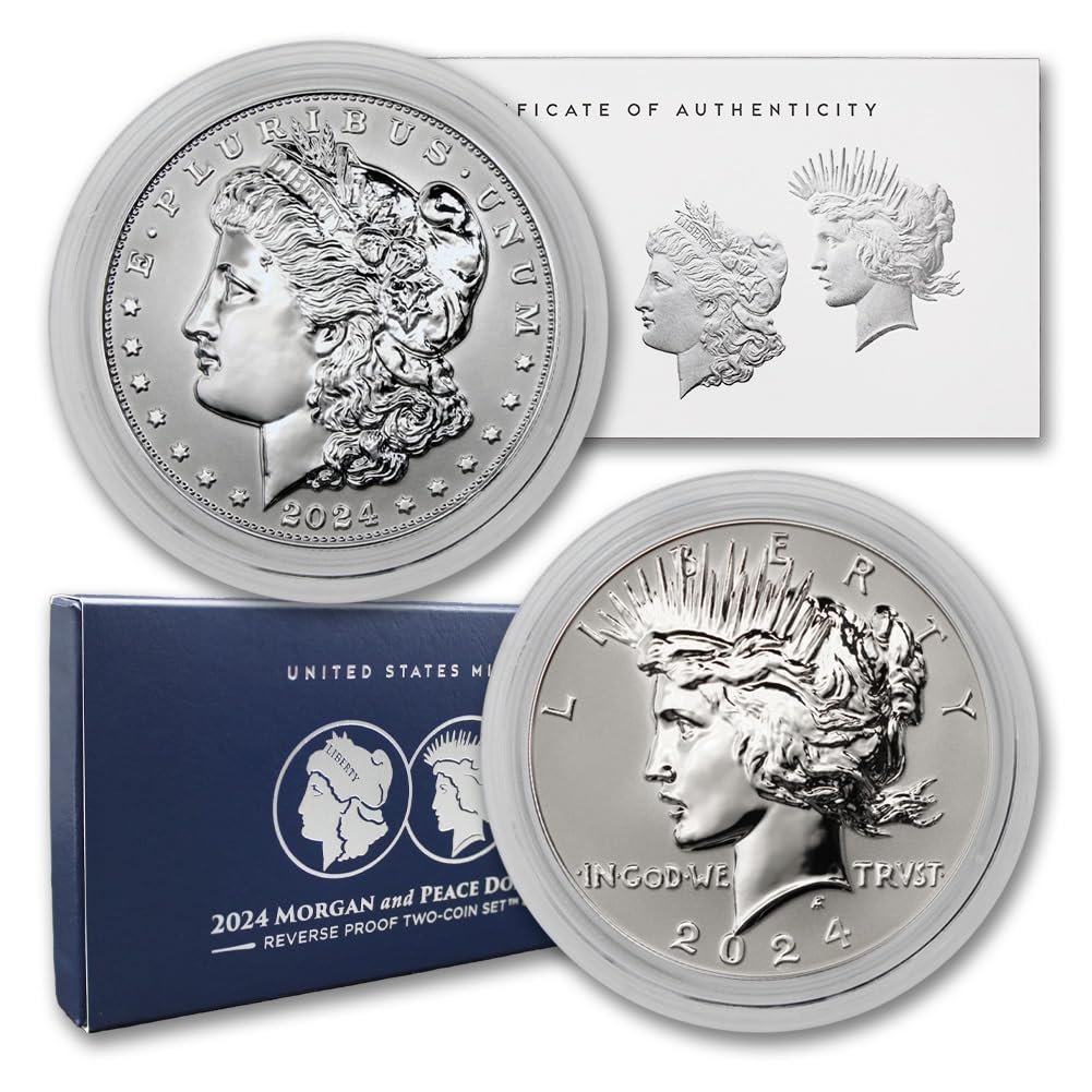 This product is a collectible coin set featuring a Silver Morgan and a Silver Peace Reverse Proof coin, both with a purity of .999 fine silver. Coin dimensions are 1.5 x 1.5 x 0.13 inches, weighing 2.4 ounces. First available on December 15, 2021, the set is ranked #11,095 in collectible coins and holds a 4.8-star rating from 13 reviews. Each coin has a diameter of 38.10 mm and a thickness of 3.2 mm, totaling 1.716 Troy ounces of silver. The coins come in their original U.S. Mint packaging.