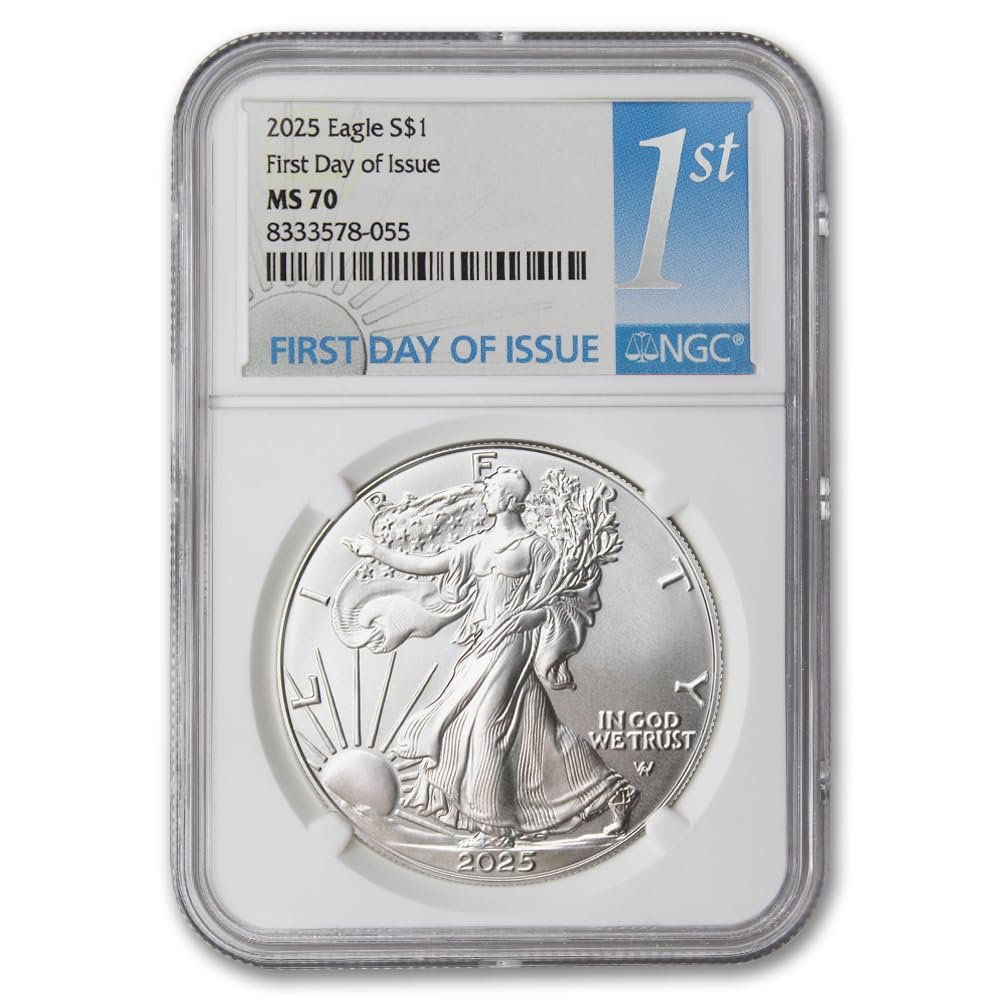 The product is a 2025 silver coin sold at various prices ($117.95 – $167.95) and features 1 troy ounce of .999 fine silver. It is issued by the United States Mint and is available in different grades, including MS-70 and PF-70 Ultra Cameo, with some coins certified by NGC and PCGS. The coin dimensions are 3.4 x 2.44 x 0.41 inches, weighing 2.4 ounces. It comes in protective packaging, and customer reviews average 3.7 out of 5 stars. The item was first available on July 22, 2020, and ranks within collectible coins.