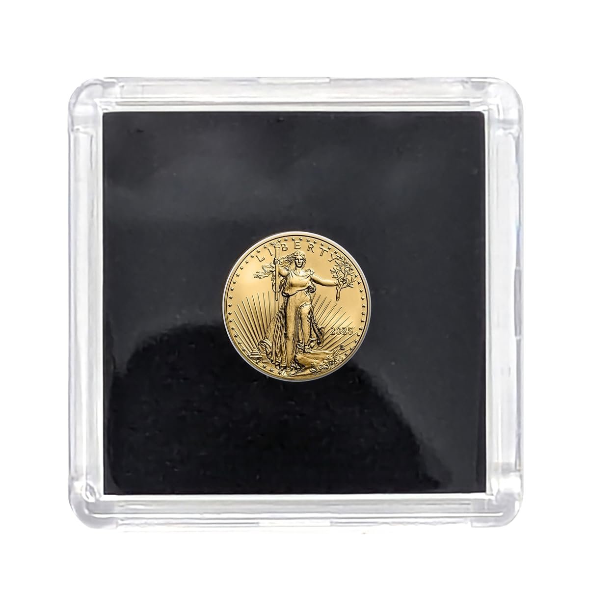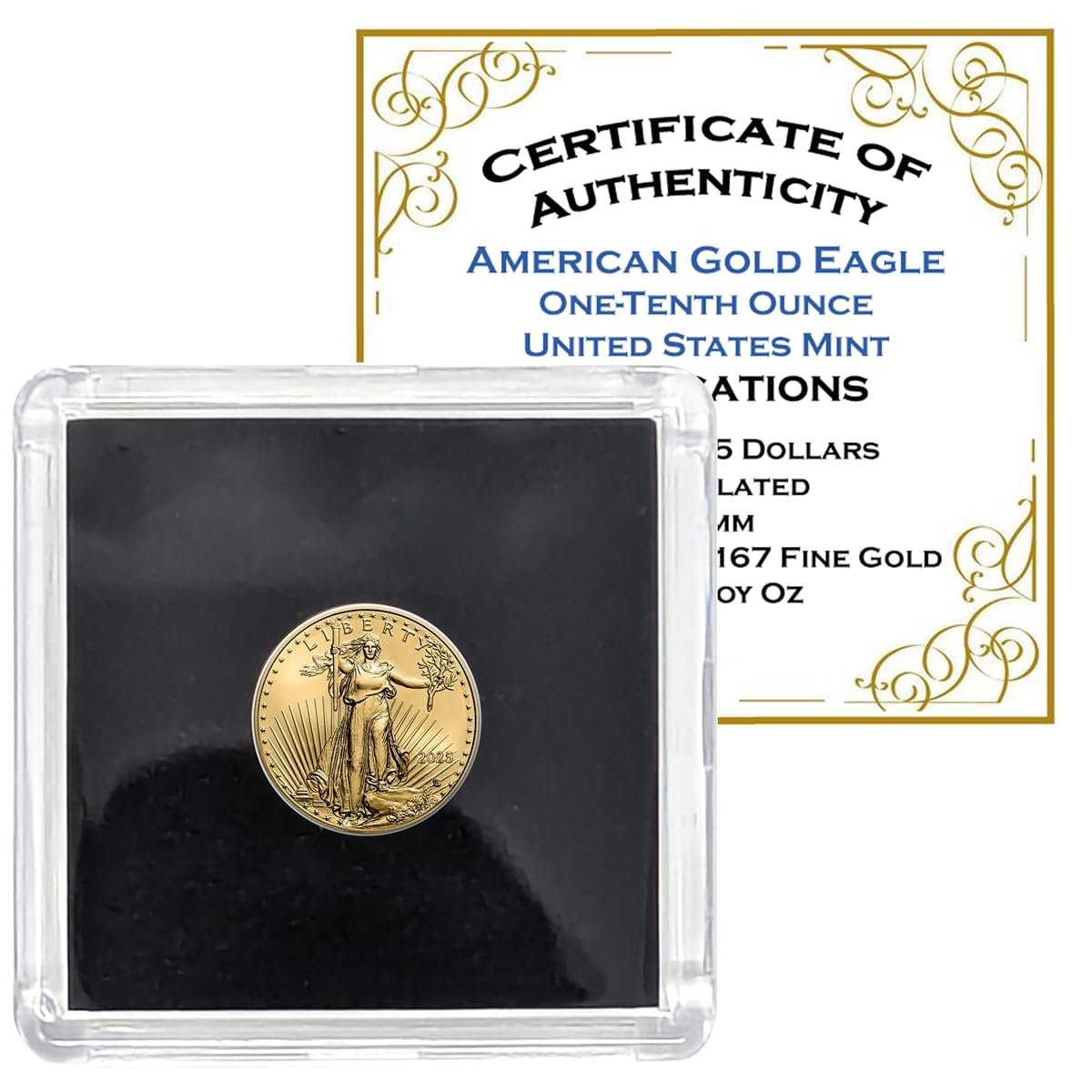 The 2025 American Gold Eagle 1/10th Ounce Coin contains 1/10 troy ounce of .9167 fine gold and measures 16.5 mm in diameter. The obverse showcases Lady Liberty, designed by Augustus Saint-Gaudens, while the reverse features a detailed bald eagle by Jennie Norris, with a monetization mark of $5. The coin is housed in a protective Square Black Background Air-Tite Capsule. Released on December 27, 2024, it ranks #14,051 in collectible coins and has a customer rating of 4.0 out of 5 stars. Made in the USA, it’s backed by the United States Mint.