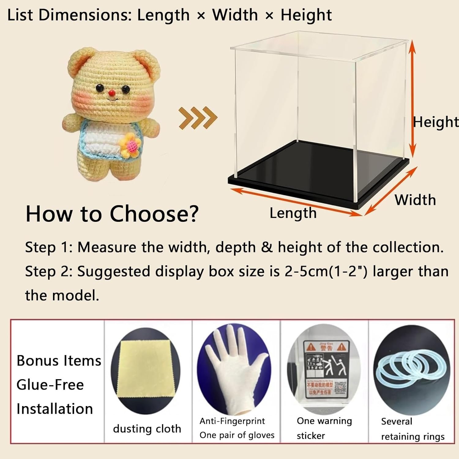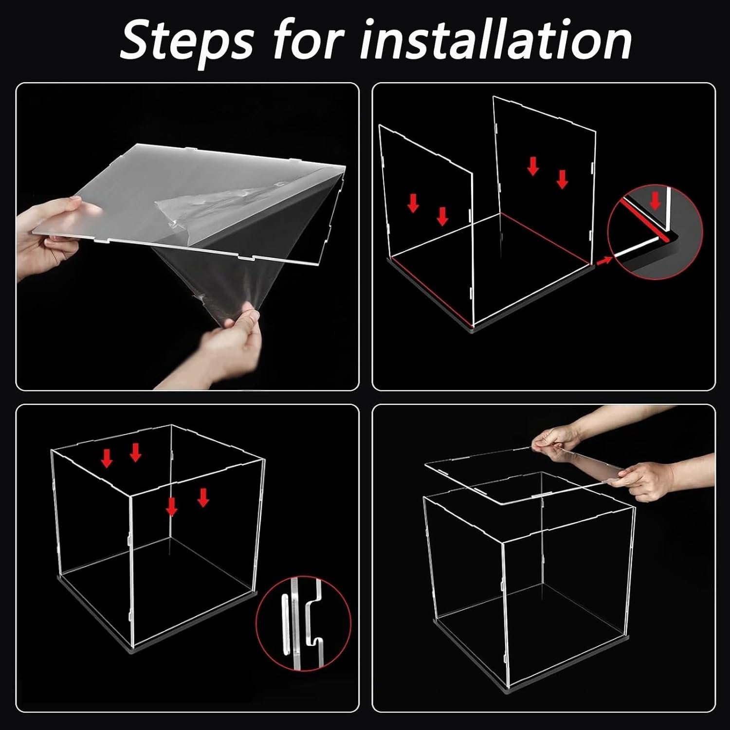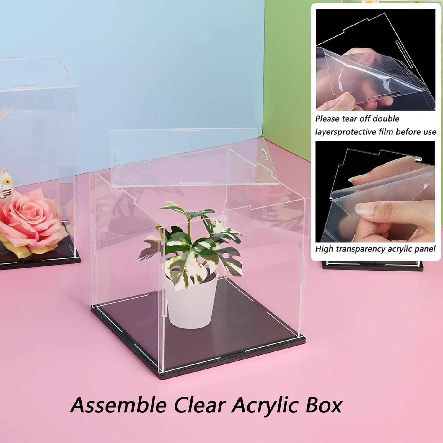 The acrylic display case features a protective film on each panel to prevent scratches during transport. Constructed from high-definition, 2mm thick acrylic with a black PVC base, it offers exceptional protection for collectibles. Key features include dustproof, UV resistance, and 98% light transmittance for a clear view. The stackable design saves space and allows for easy assembly. Customizable sizes are available. The package includes one display box, with instructions to remove the protective film before installation. Ideal for showcasing various items, the case ensures durability and visibility while prioritizing customer satisfaction.