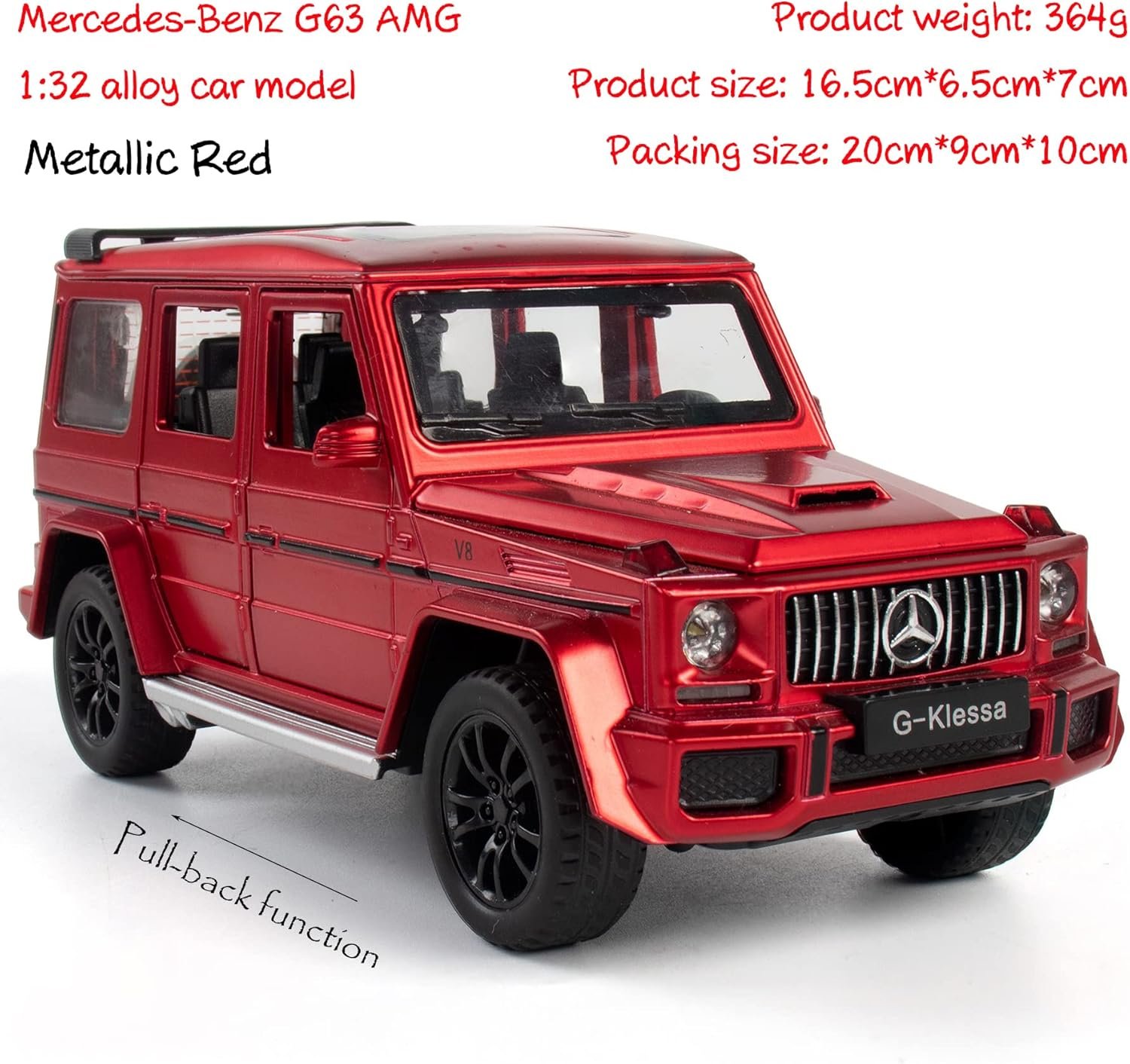 The Benz G63 AMG alloy car model is a 1/32 scale toy measuring 6.5 x 2.56 x 2.76 inches and weighs about 380g. Made from alloy and plastic, it features sound and light functions, as well as operable doors, hood, and trunk. To use, remove the battery insulating sheet, press the front for sound and light, and pull back to let it run forward. Packaged in a foam box, it’s recommended for ages 3 and up due to small parts. Care instructions warn against mixing battery types. Ideal for collection or gifting.