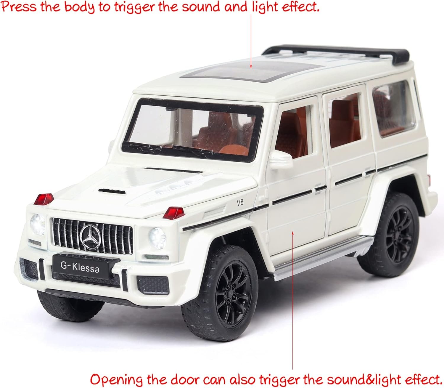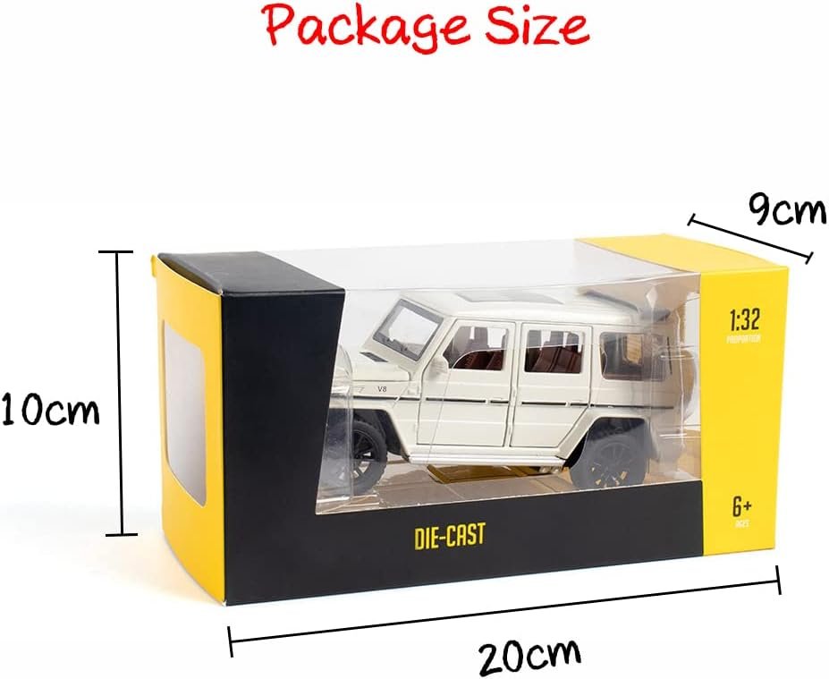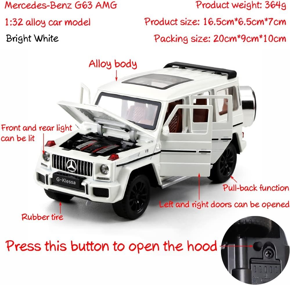 The Benz G63 AMG Alloy Car Model is a 1/32 scale toy measuring approximately 6.5 x 2.56 x 2.76 inches and weighing around 380g. Made of alloy and plastic with a battery included, it features sound and light functions, as well as operable doors, hood, and trunk. To use, remove the insulating sheet, press the front for sound and light, and pull it back to make it move forward. Packaging includes an independent color foam box. Warning: contains small parts; not suitable for children under 3. Ideal for home collection or as a gift.