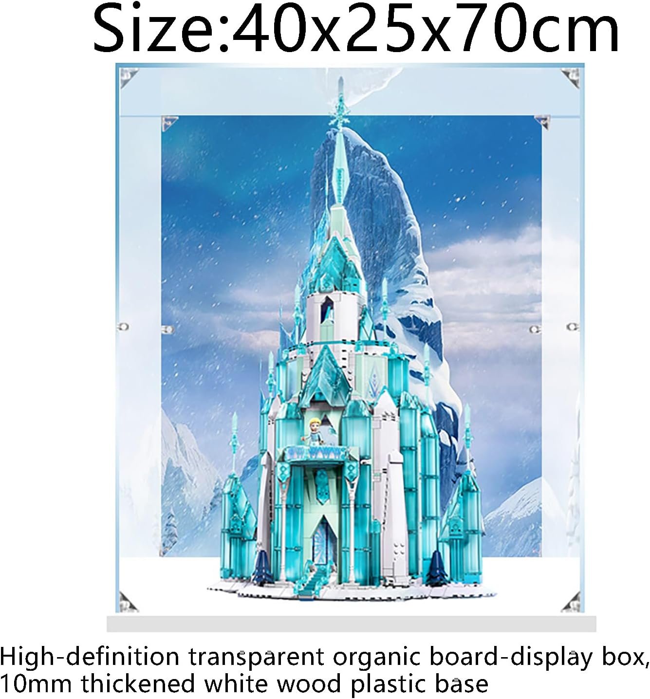 The product is a transparent acrylic display stand designed for toys, specifically compatible with Lego 43197 Ice and Snow Castle models (model not included). Measuring 40x25x70cm with a thickness of 3mm, it offers dustproof protection, enhancing the display of collectibles. The stand is easy to assemble without extra tools or adhesives. Ideal for various storage areas like living rooms, bedrooms, or studies, it safeguards models from damage and ensures they’re displayed attractively. Caution is advised to place it securely on stable surfaces away from high or hot locations.