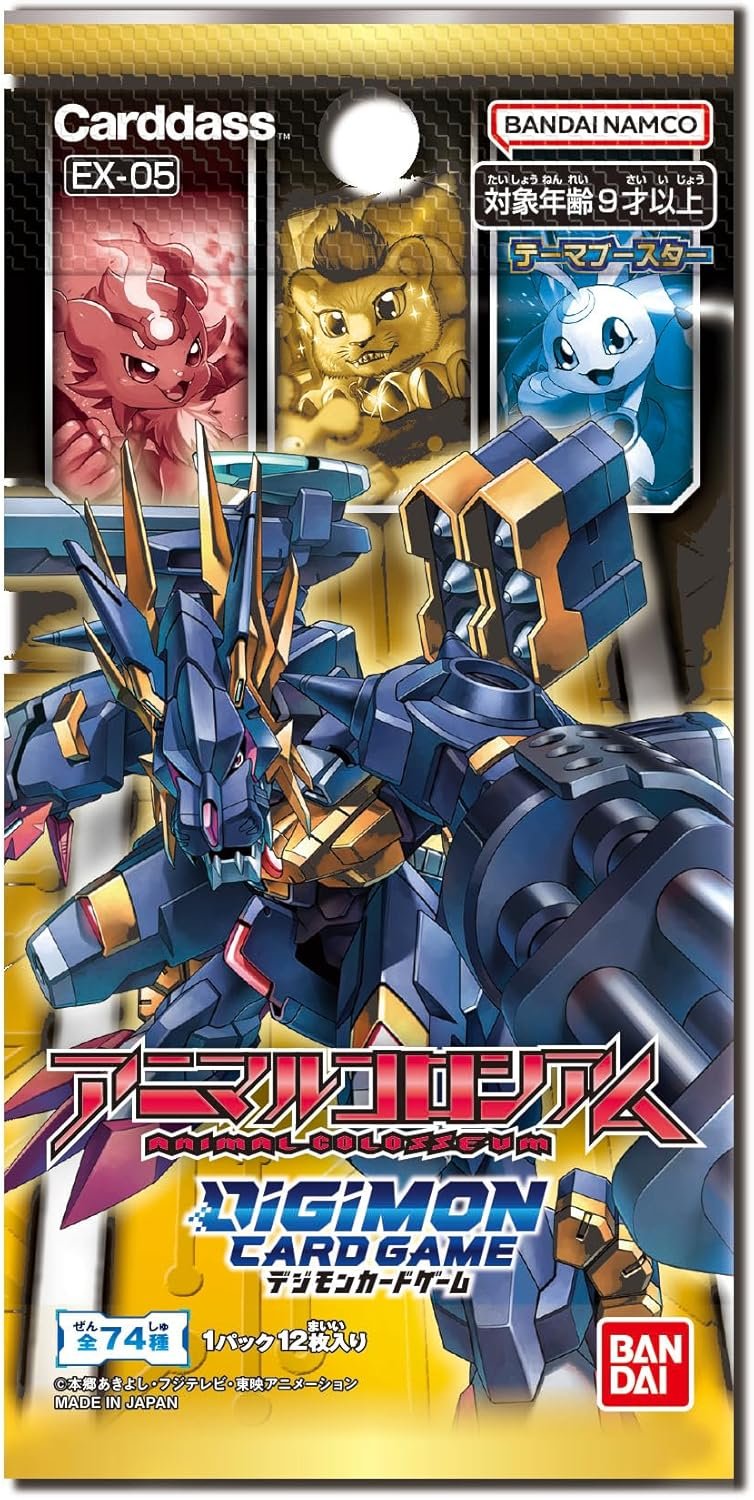The Digimon Card Game Theme Booster Animal Colosseum EX-05 includes 12 cards per pack and features a total of 74 types. Highlights include the ACE cards of the four sacred beasts, the introduction of Fang Rommon, and popular Digimon and Tamers from the game. It also presents a new keyword effect called “indestructible.” The set comprises 22 common, 20 uncommon, 18 rare, 12 super rare, and 2 secret rare cards, along with a parallel card.