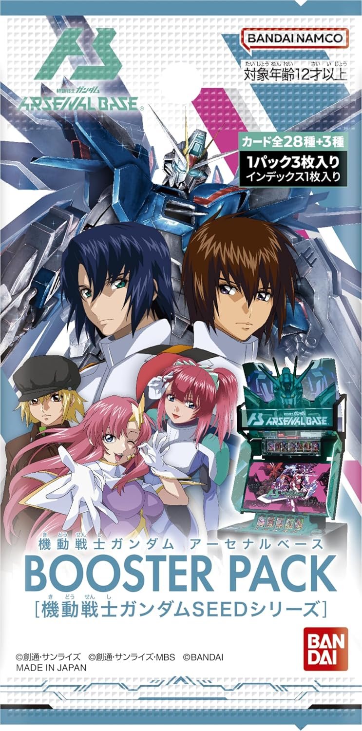 The Bandai Mobile Suit Gundam Arsenal Base BOOSTER Pack features 10 packs from the Mobile Suit Gundam SEED series. It includes a total of 31 card types: 10 R-types, 8 M-types, 6 P-types, 4 U-types, 2 Para-types, and 1 SEC type. Each pack contains 3 pieces, with a full box consisting of 10 packs.