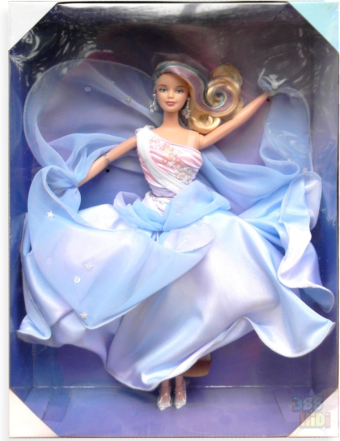 Whispering Wind Barbie embodies ethereal grace with her iridescent blue-lilac skirt and chiffon stole, designed to swirl elegantly. Her pink satin bodice is adorned with shimmering star-shaped sequins, while a delicate dove accentuates her closeness to nature. With long, wavy platinum hair streaked in lilac and blue, she represents freedom and beauty. The collectible doll includes a matching stand and a two-year warranty. Her taffeta skirt features a palette of swirling sky blue and lilac, complemented by a sequined chiffon sash. Released in 1999, her SKU number is 22834.