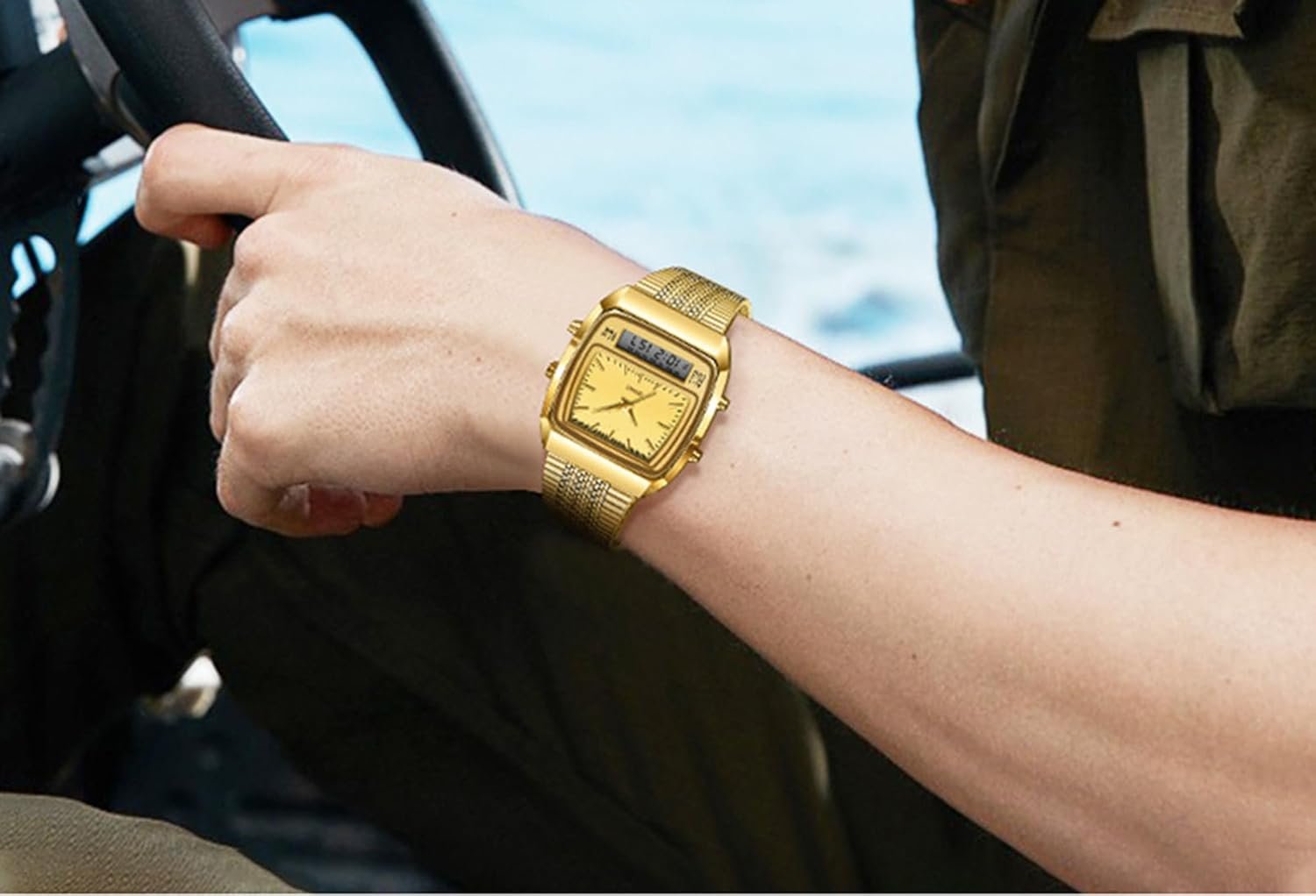 The watch features a square dial with an analog display, blending casual, fashion, and outdoor styles. Its quartz movement ensures precision, while a stainless steel case and strap provide durability. The 34.5mm diameter and 10.5mm thickness make it suitable for various occasions, both business and leisure. It is water-resistant for daily activities but not for swimming or hot water. The watch measures 210mm in length and requires one LR44 battery (included). Available from January 2024, it has a 3.6-star rating from 12 reviews, ranking #1,463 in men’s wristwatches.