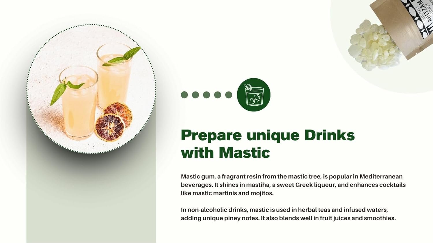 Fresh Chios Mastiha Tears Gum is a 100% natural mastic sourced from the mastic trees of Chios Island, Greece. Hand-cleaned by local growers, this gum has unique properties recognized by the scientific community. It may soften in warm conditions but can be restored by cooling or freezing. Mastiha does not spoil and retains its beneficial qualities over time, although it may yellow due to oxidation. Initially, it has a bitter taste that becomes pleasant with time. Mastiha is also beneficial for body hygiene and skin care and can be used as a spice in cooking.