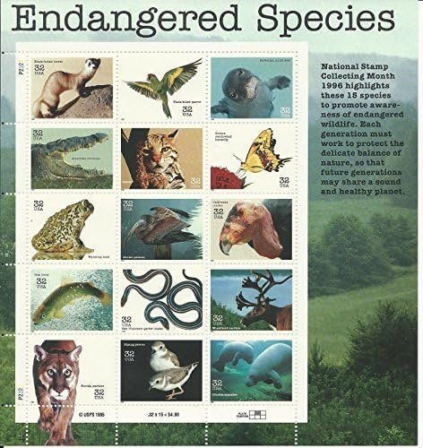 The “Endangered Species Collectible Sheet” features fifteen 32-cent stamps, each depicting a different endangered species. This collection aims to raise awareness about the importance of conservation and protecting these vulnerable animals. Each stamp showcases unique artwork, highlighting the beauty and diversity of endangered wildlife. Collectors and nature enthusiasts can appreciate the artistic and environmental significance of this limited edition sheet.