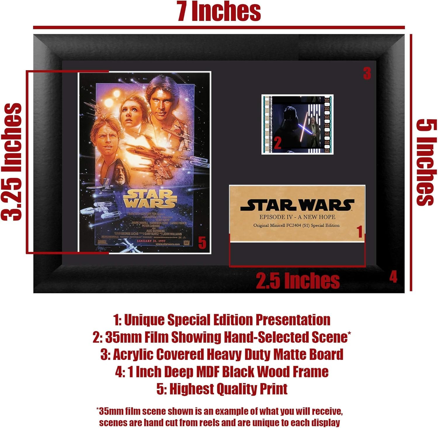 This FilmCells Presentation showcases art and a 35mm film clip from “Star Wars: Episode VI – A New Hope” (1977), where Luke Skywalker teams up with allies to combat the Empire and rescue Princess Leia from Darth Vader. Each officially licensed piece features high-quality framing and hand-cut film strips, ensuring unique collectibles. The presentation includes a special edition plaque, and is designed for easy display with a Certificate of Authenticity. Perfect for any room, it highlights iconic characters like Luke, Leia, Han Solo, and more. Made in the UK, it measures 7 x 5 inches.