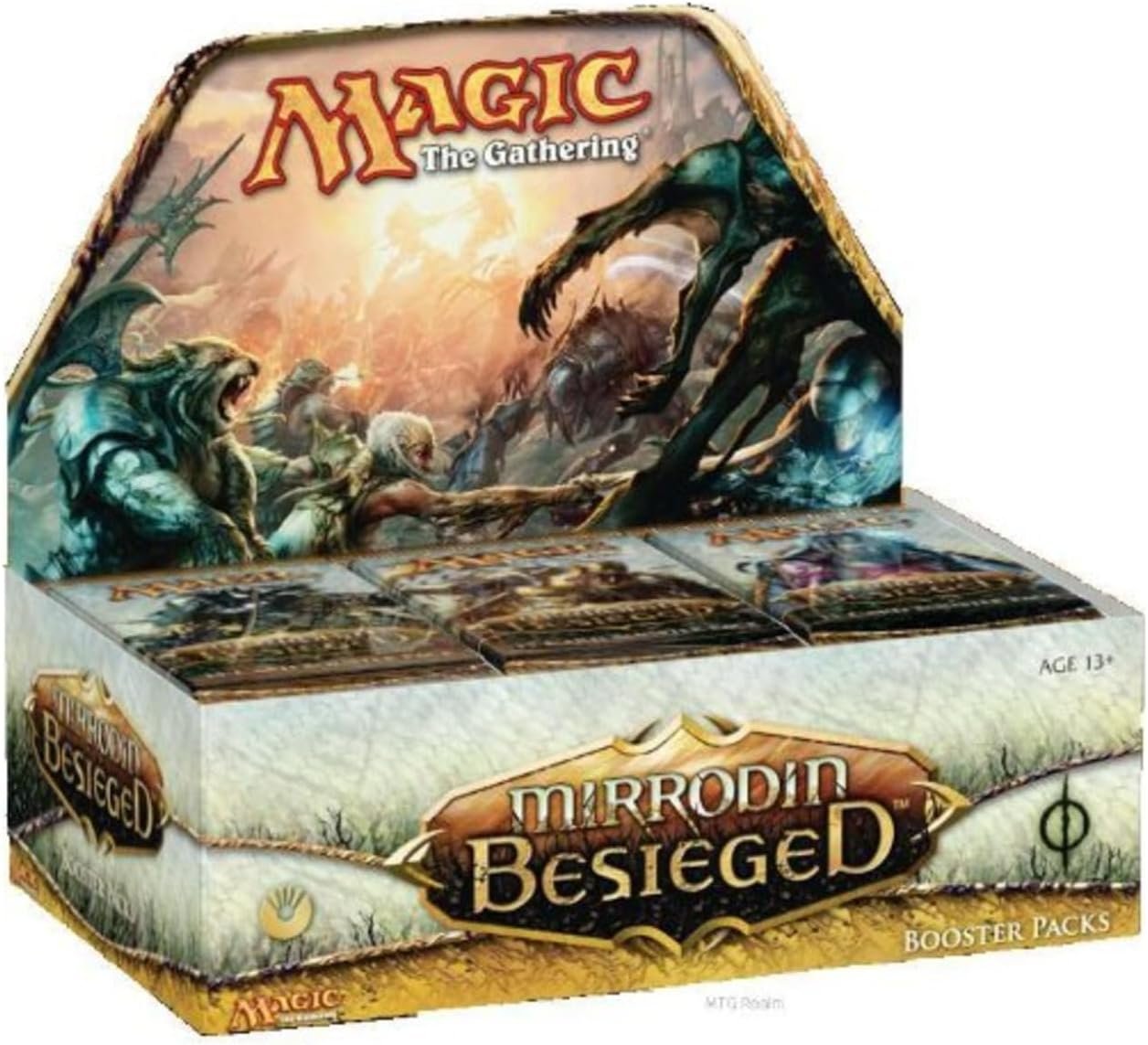 The product is a box of “Mirrodin Besieged,” the second set in the “Scars of Mirrodin” block, containing 36 packs with 15 cards each. It features 145 cards in total and includes randomly inserted premium foil and token cards. The unopened box is in original factory-sealed packaging and introduces two new game mechanics.
