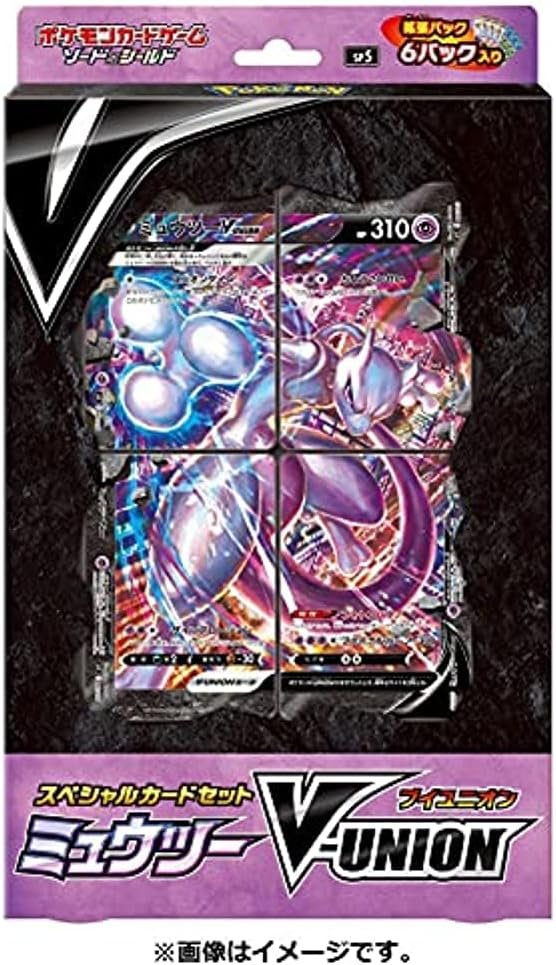 The Special Card Set Mewtwo V-Union Pokémon contains a set of four promo cards featuring Mewtwo V-Union, a new support promo card, and six booster packs (three from Towering Perfection and three from Blue Sky Stream).