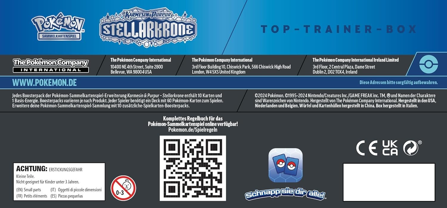 Explore the underground world of teracristallisation in the Pokémon TCG expansion, Crimson & Purple – Stellar Crown. Featuring legendary Pokémon Terapagos and new Stellar Teracristal Pokémon-ex like Liberlo-ex and Lapras-ex, the expansion introduces exciting ASS Class cards. Each Top Trainer Box includes 9 booster packs, a holographic Noctuh promo card, energy cards, damage dice, and stunning Terapagos card sleeves. Also included are a play guide, a storage box, and a code for Pokémon TCG Live, making it a must-have for collectors and players. Discover the potential of this thrilling new expansion!