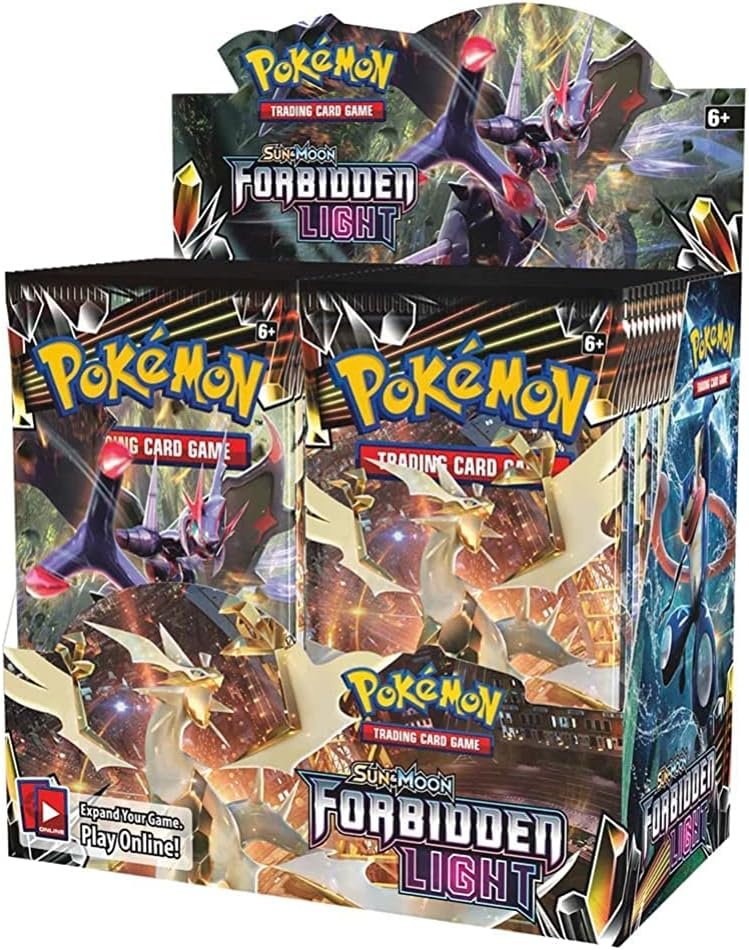 Necrozma has transformed into Ultra Necrozma-GX after absorbing a Legendary Pokémon, igniting a response from various Pokémon like Lucario-GX, Greninja-GX, and Arceus. The Pokémon TCG: Sun & Moon—Forbidden Light expansion includes over 130 cards, featuring 8 Pokémon-GX (including 6 ultra beasts), 15 new trainer cards, and 2 special energy cards. The display offers 36 booster packs, inviting players to uncover exciting Pokémon and treasures.