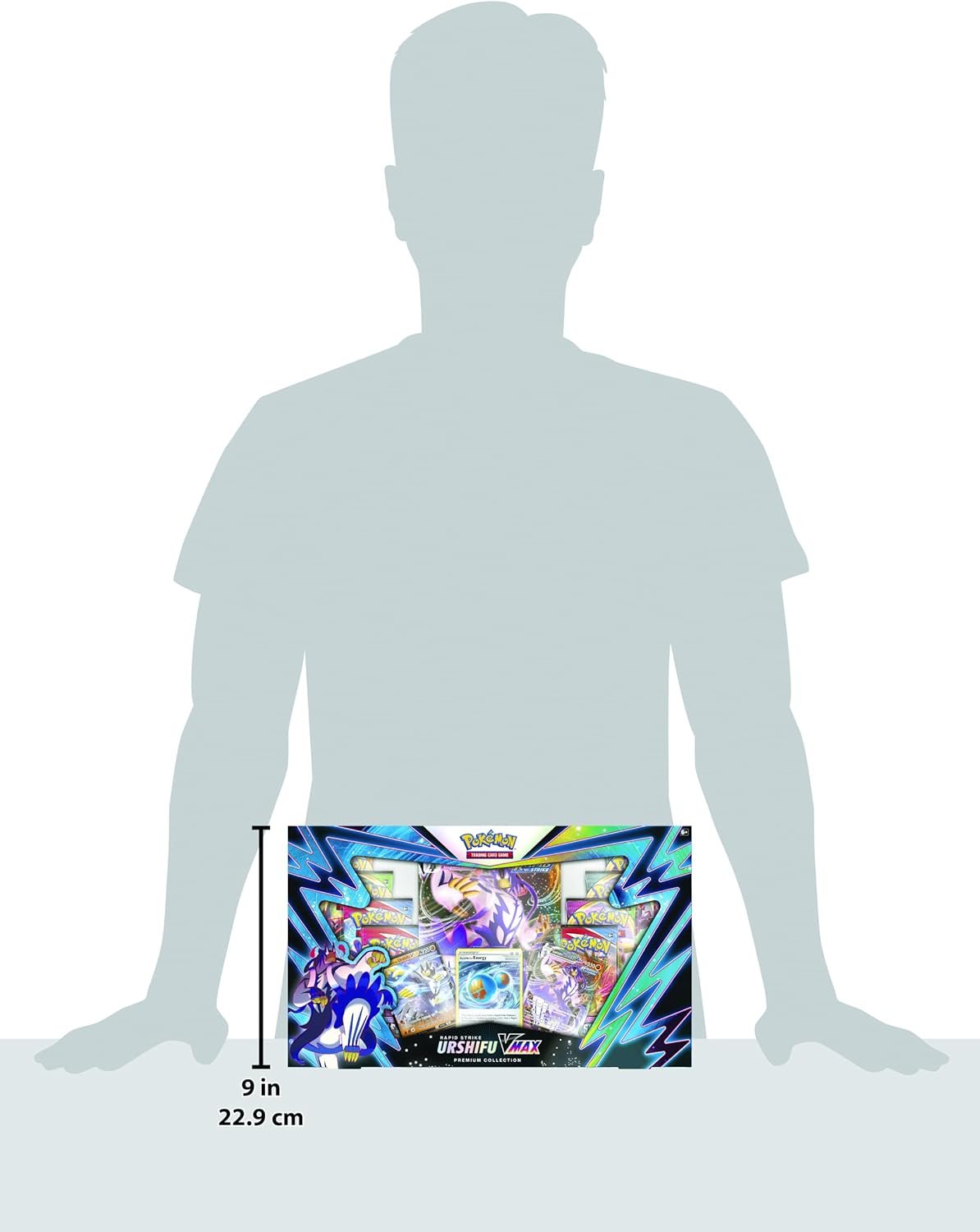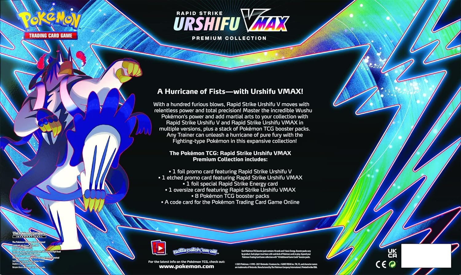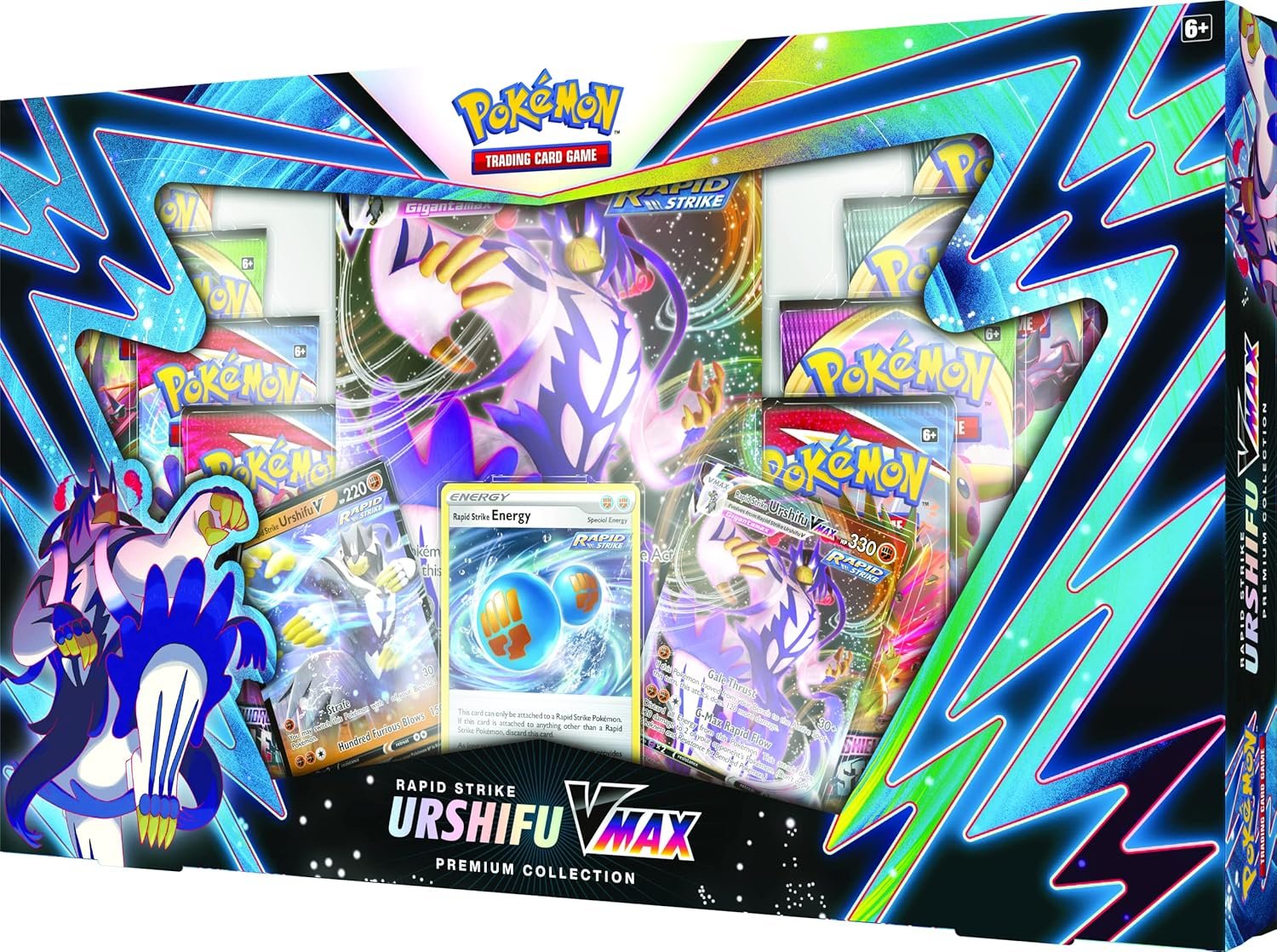 The Pokémon TCG: Urshifu Rapid Strike Vmax Premium Box includes 8 booster packs, a V Promo Card, a V Max Promo Card, an Energy Card, an oversized card, and a code card for online play. This box boosts your collection with a powerful Vmax card and offers a chance to find skilled Trainers and allies. Collect cards featuring your favorite Pokémon and unleash the power of Urshifu VMAX!