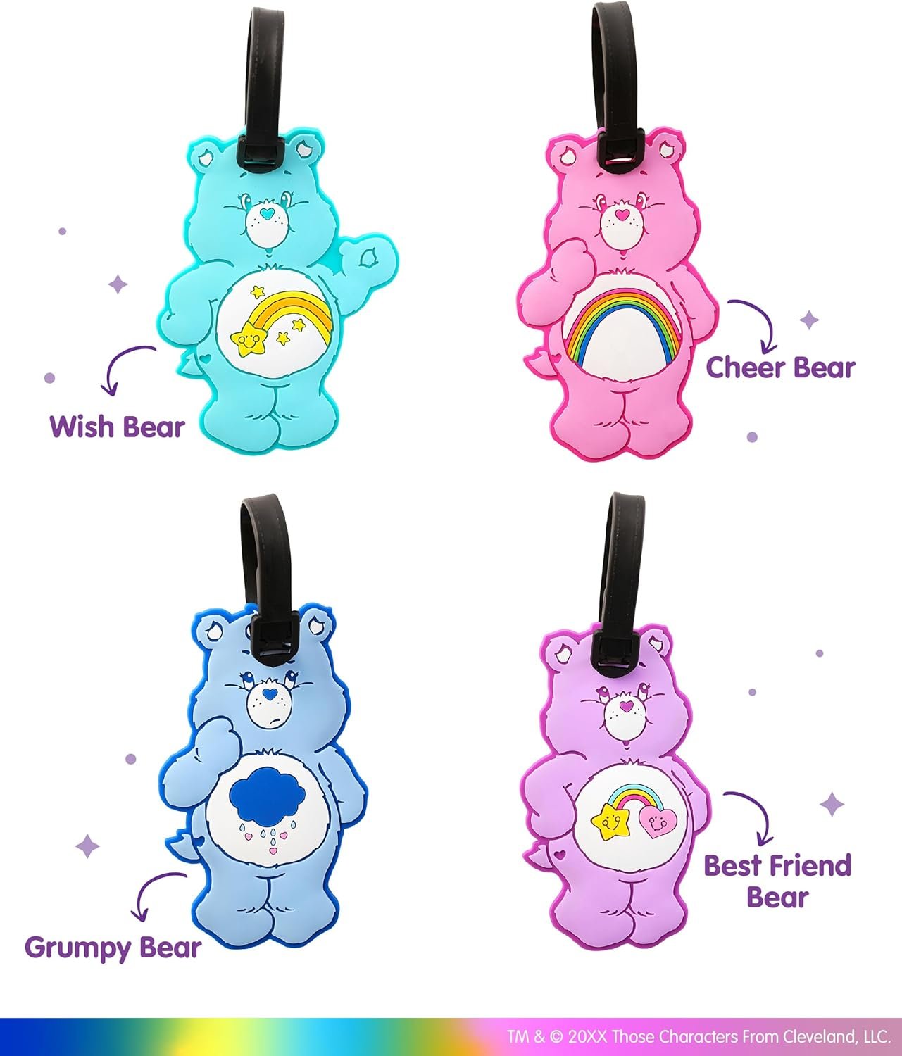 Discover an assortment of officially licensed Care Bears products including jewelry and luggage tags, perfect for gifting. With products like BFF necklaces and adorable earrings, the collection features highly-rated items such as the Crystal Keychain and Cheer Bear Necklace. Prices range from $14.99 to $24.99. These items make great gifts for birthdays and holidays. Each luggage tag represents a unique Care Bear character, offering easy identification while traveling. Founded in 1977, SallyRose specializes in quality, timeless designs suitable for all ages.