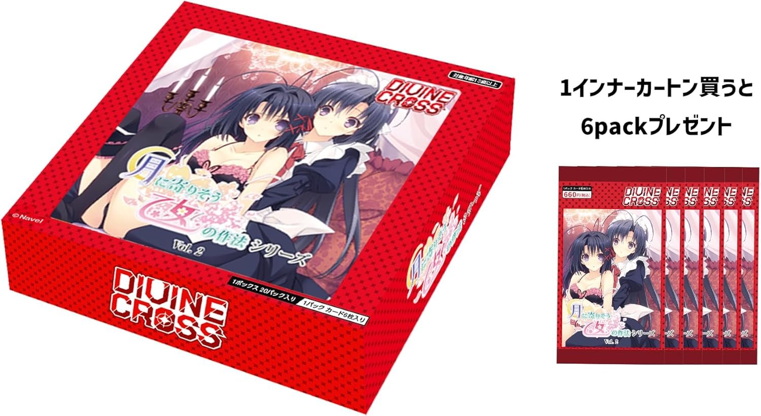 The “Maiden Soulo Naru to the Moon Vol. 2” plus pack set by DIVINE CROSS features a collaborative trading card game with beautiful illustrations and an accessible gaming system for beginners. Each set includes 5 booster packs, totaling 6 cards per pack across 20 packs in 6 boxes. The collection boasts rare, serial-numbered secret cards and various card types, including normal and special rarity cards. Each box contains 1 PR card, with 4 total per carton. Card dimensions are H88 x W63 mm.