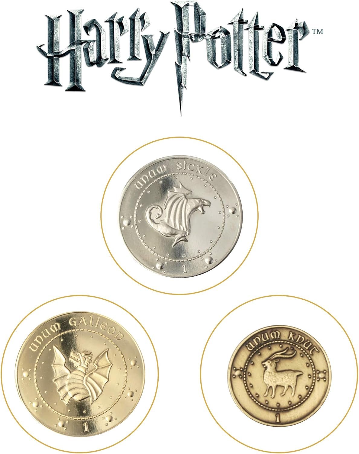 Unlock the magic of the wizarding world with this officially licensed Gringotts Bank Coin Collection. Housed in a collector’s box, these authentic replicas feature carefully crafted coins: the Galleon, Sickle, and Knut, each beautifully plated in gold, silver, and copper.